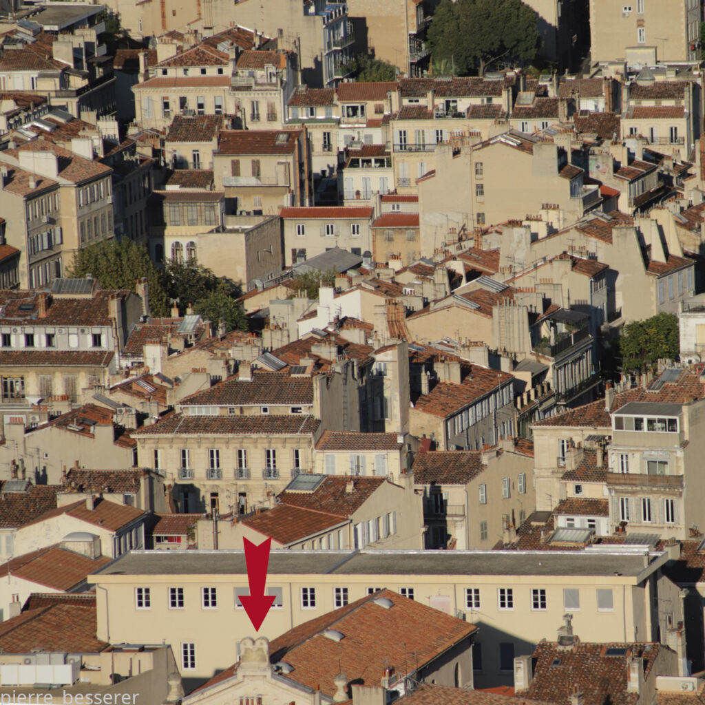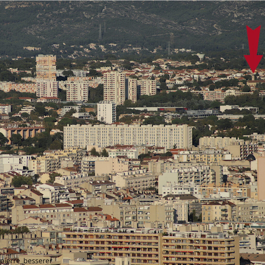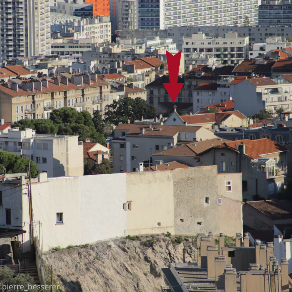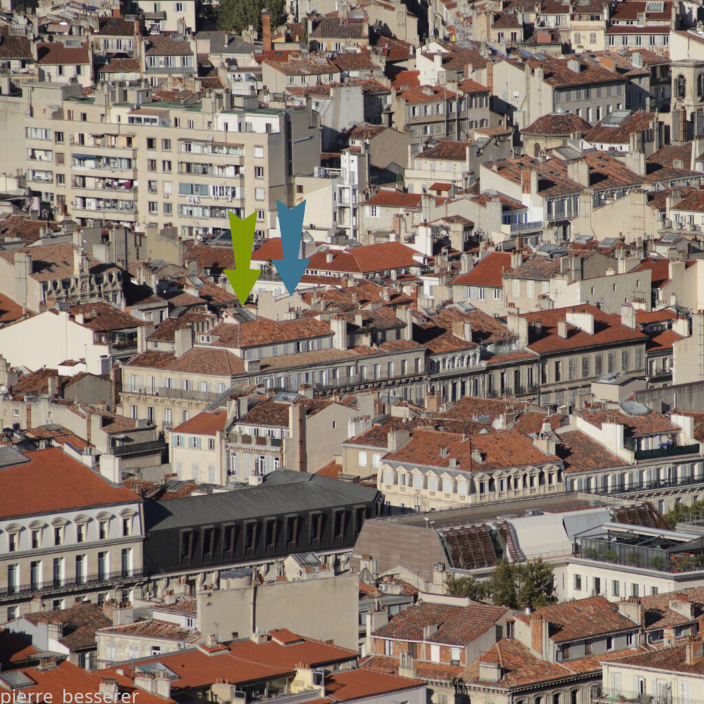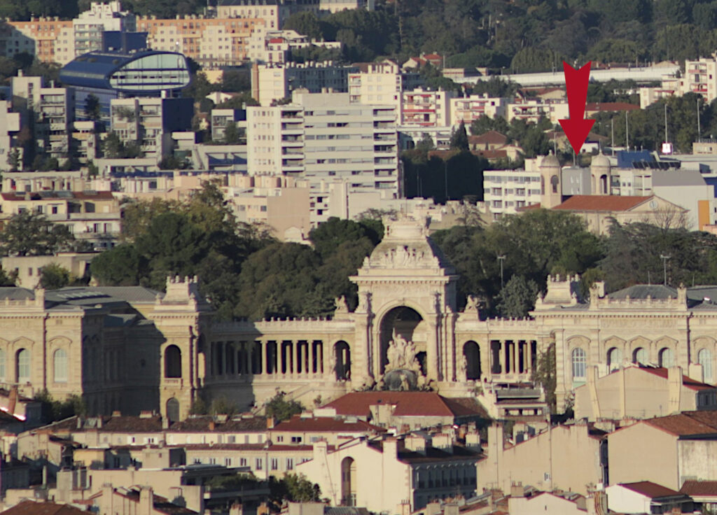 Les flèches rouges pointent une église ou un site existant, les vertes une église masquée depuis mes fenêtres;, les bleues vers une église disparue. Les photos ont été prises depuis le parvis de Notre-Dame de la Garde, toutes le même après-midi d’automne.