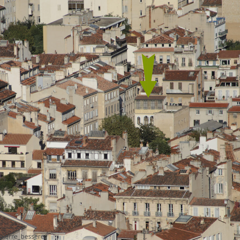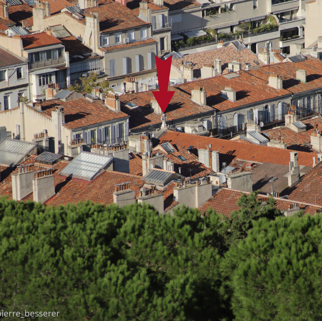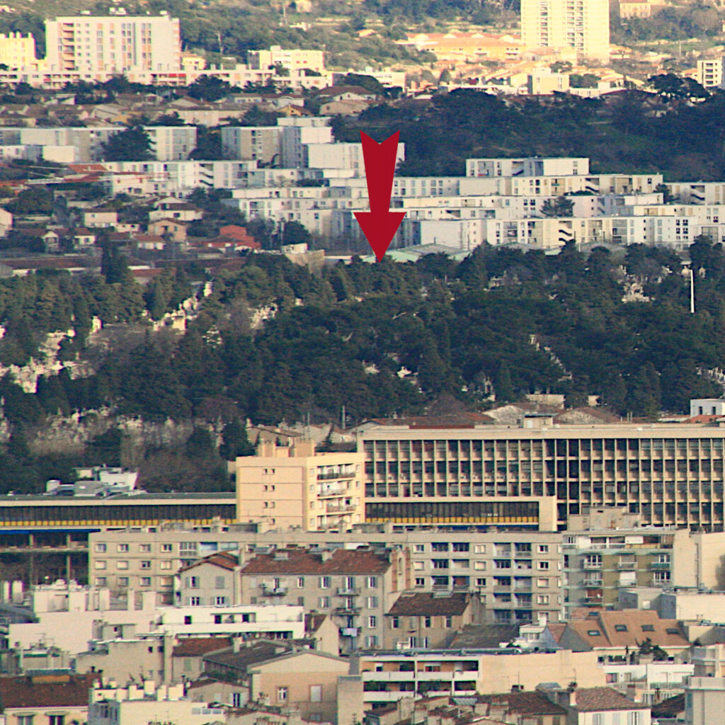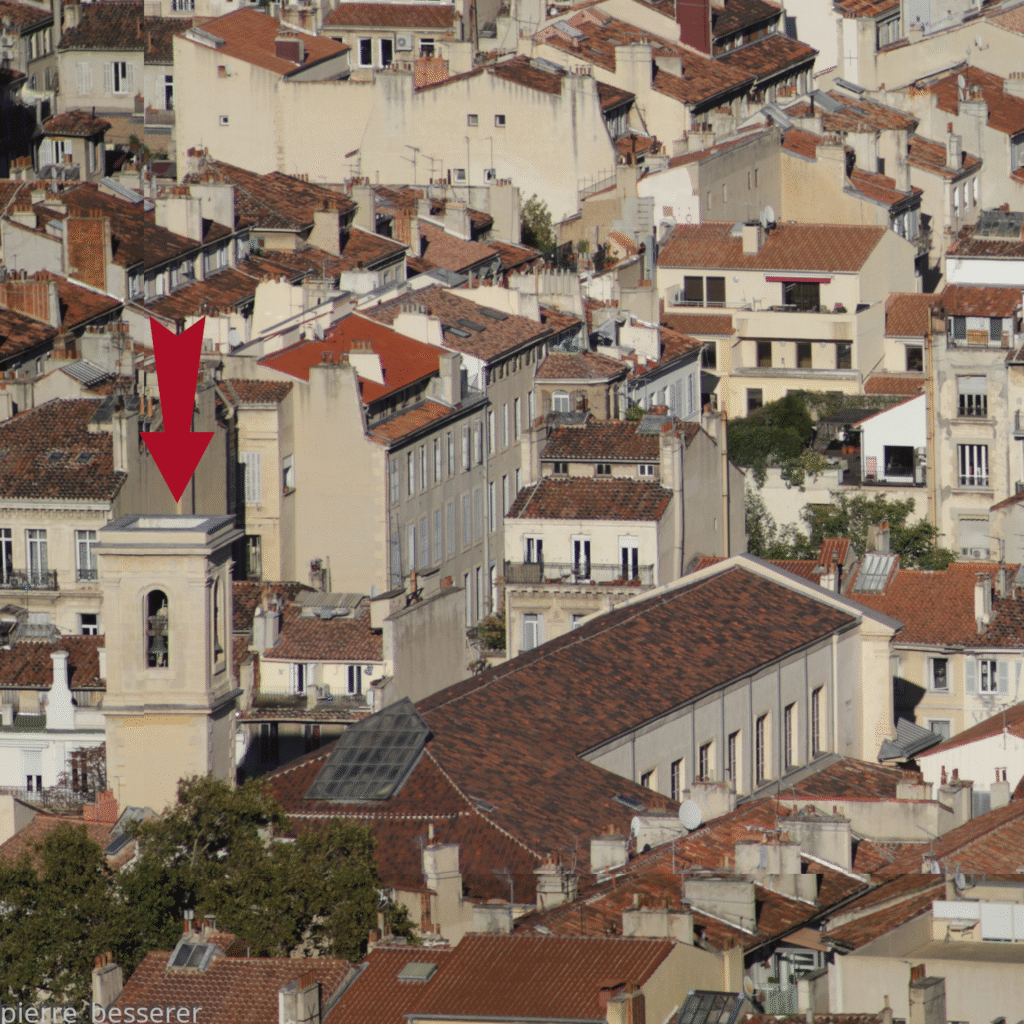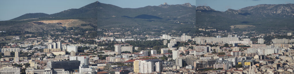 Les flèches rouges pointent une église ou un site existant, les vertes une église masquée depuis mes fenêtres;, les bleues vers une église disparue. Les photos ont été prises depuis le parvis de Notre-Dame de la Garde, toutes le même après-midi d’automne.