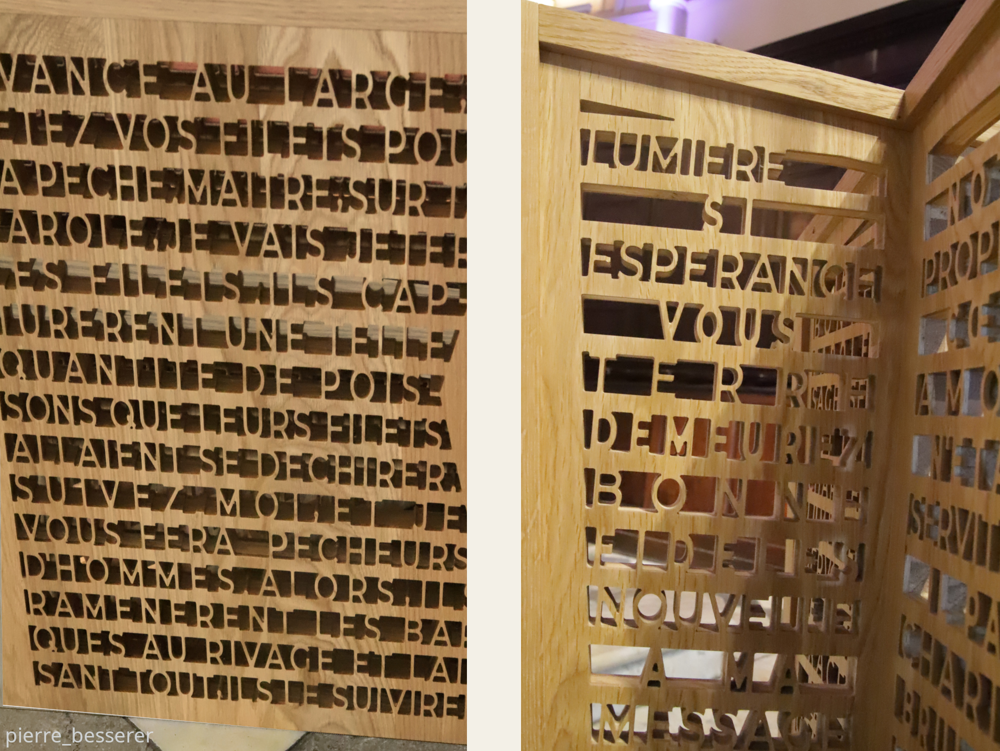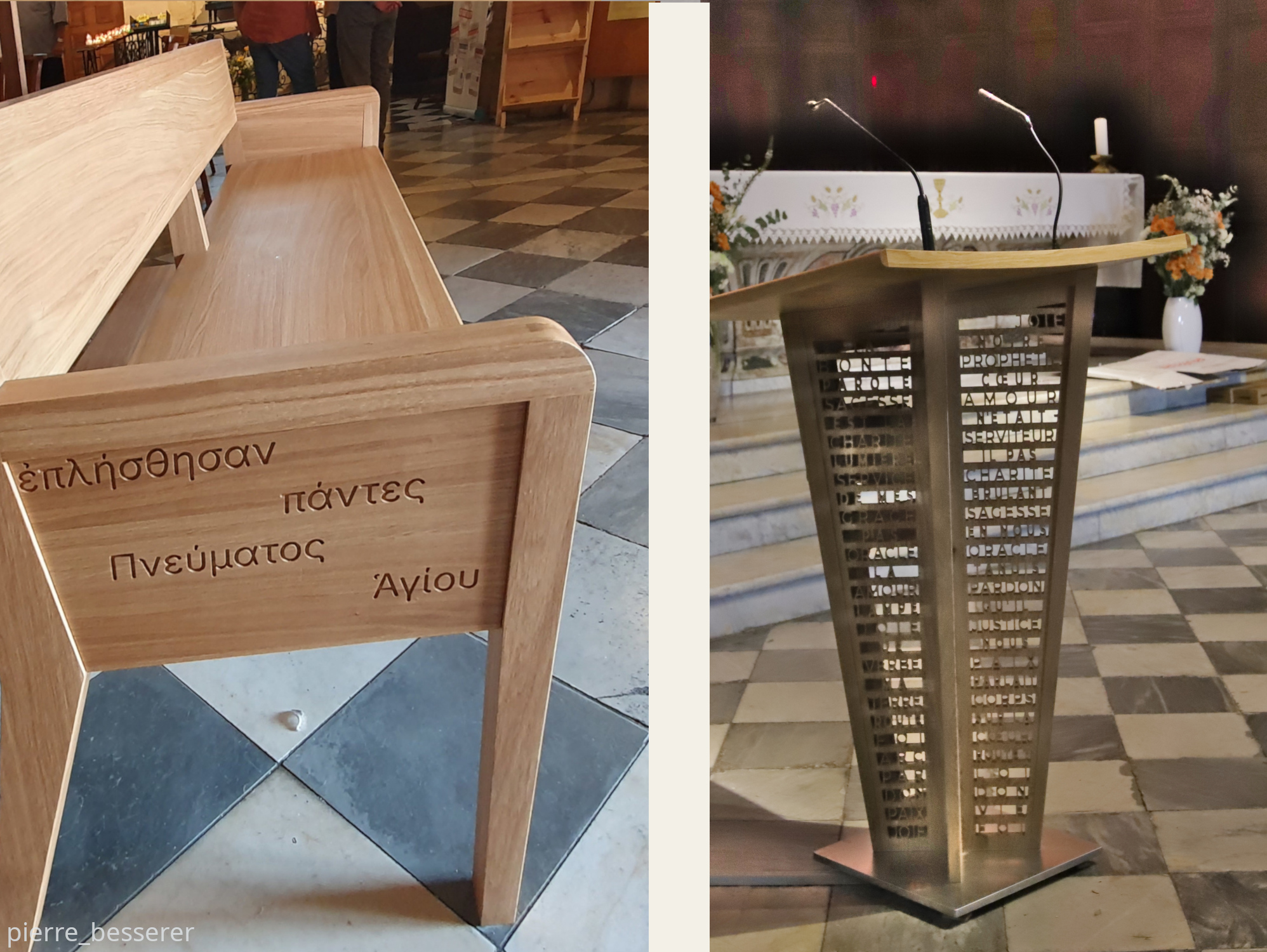 Depuis l’automne 2025, le sanctuaire accueille un nouveau mobilier en chêne clair. Des versets bibliques ont été gravés en 14 langues*** sur les accoudoirs des bancs et découpés en dentelle sur l’ambon et les sièges de présidence. Le projet a été audacieux : il voulait allier l’aspect utilitaire à une dimension spirituelle et artistique en vue de répondre à la vocation d’accueil universel de l’église.
